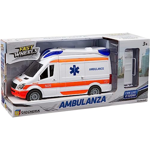 Gioco Ambulanza con luci e Suoni e Movimento a Ruote libere. Portiere apribili e meccanismo di Uscita della barella.