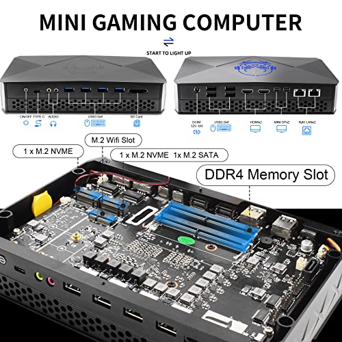 Grande spazio di archiviazione e capacità espandibile: mini computer da gioco F9 installato con DDR4 a doppio canale max 64 GB RAM 260 pin DDR4 SO-DIMMs. Ci sono due slot SSD per soddisfare la tua richiesta di grande capacità, SSD1 supporta SSD M.2 NVME/SATA (interfaccia PCIE3.0/SATA 600) e SSD2 supporta solo M.2 NVME (SATA600). È possibile premere CANC per accedere al BIOS e F11 per accedere a Fast-Boot Setup per qualsiasi impostazione come preferisci.
