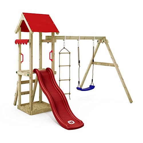 Gioco da giardino WICKEY TinyCabin con altalena e scivolo rosso, struttura da esterno per bambini con sabbiera, scaletta e accessori da gioco