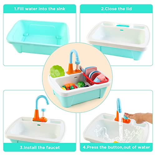 DeAO Set da gioco per lavello da cucina, 28 pezzi, include giocattoli da taglio, utensili da cucina, rubinetto dell'acqua e scarico, ideale per bambini
