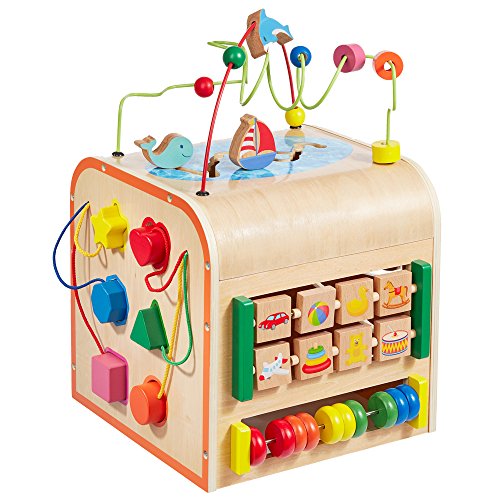 Dimensioni Cubo Gioco Legno: larghezza: 34cm, altezza: 45 cm, profondità: 34 cm, per bambini da 1 anno in su