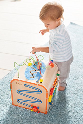 Il grande dado motorio di howa ha tante funzioni: il pallottoliere con un piccolo mondo marino richiede abilità, le 6 forme magnetiche per apprendere le forme, i colori e le capacità motorie, riconoscere e combinare numeri e figure, gli ingranaggi e la pista a sfera richiedono capacità motorie e fanno tanto divertire.