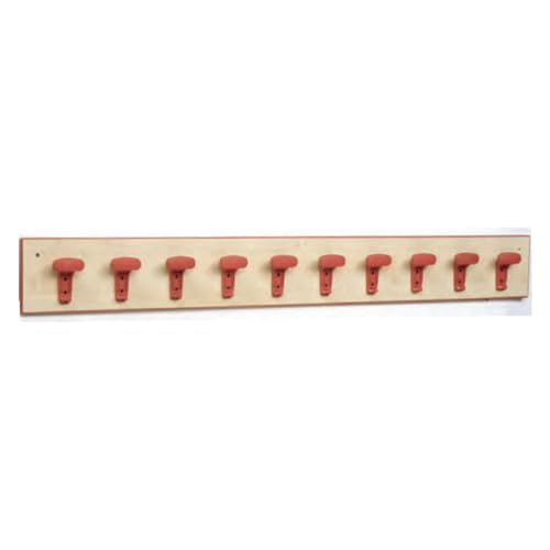 Fascia in conglomerato ligneo da 20 mm bilaminato finitura acero con bordo in abs da 3 mm raggiato colore rosso.Attrezzata con 10 appendini in polipropilene con doppio gancio.Predisposta per fissaggio a parete con tasselli ad espansione (non inclusi).Dimensioni: cm 156X18h