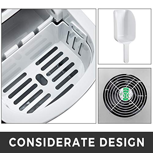 Considerare I Dettagli: Riempimento manuale richiesto con serbatoio dell'acqua da 2,4 litri (0,53 galloni UK). Qualità dell'acqua e del ghiaccio sotto il tuo controllo. Il secchiello del ghiaccio e la paletta sono realizzati con materiale di qualità alimentare. Secchio facilmente staccabile. Il condensatore con una grande quantità di flusso d'aria garantisce una più rapida dissipazione del calore e una più rapida produzione di ghiaccio.