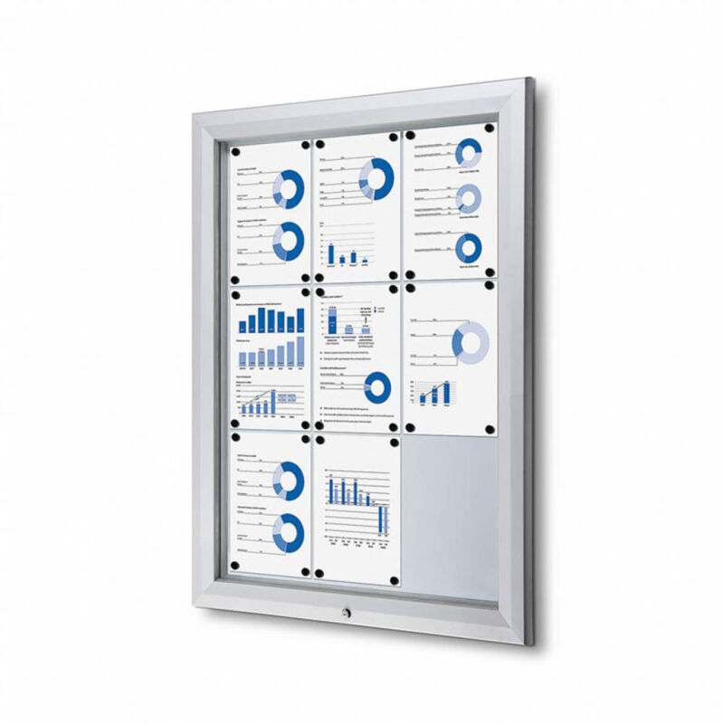 Bacheca Bacheca da Esterno con Apertura a Ribalta 80,5x106,7x4,7 cm in Alluminio con Led Silver La bacheca per esterni è realizzata in alluminio estruso, con spigoli arrotondati e una finitura anodizzata silver. Il fondo è magnetico, scrivibile e cancellabile, realizzato in acciaio laccato bianco. L'apertura a ribalta è realizzata in vetro temperato e dotata di serratura, fornita con due chiavi. La bacheca è illuminata internamente grazie a strip a LED con trasformatore integrato e il vetro temperato è certificato ESG. Questa bacheca è resistente all'acqua e alla polvere con un grado di protezione IP56 ed è dotata di apertura con pistoni a gas. Il kit per il fissaggio a parete è incluso e il formato è 9xA4, con dimensioni di 80,5x106,7x4,7 cm. Caratteristiche Tecniche bacheca per esterni Materale: in alluminio estruso Spigoli arrotondati anodizzato silver Fondo magnetico scrivibile e cancellabile in acciaio laccato bianco Apertura a ribalta in vetro temperato con serratura Fornita con