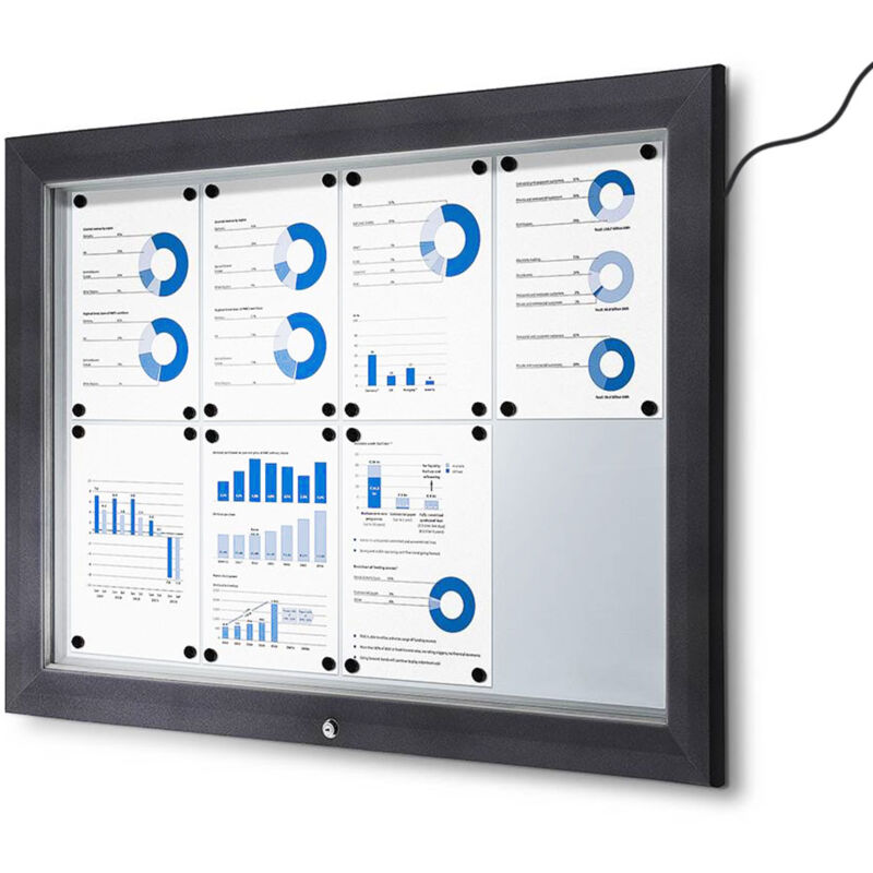 Bacheca Bacheca da Esterno con Apertura a Ribalta 102,5x76x4,7 cm in Alluminio con Led Grigio Antracite La bacheca per esterni è realizzata in alluminio estruso, che la rende resistente e duratura nel tempo. I suoi spigoli arrotondati la rendono sicura e priva di sporgenze pericolose. Il colore grigio antracite verniciato a polveri le dona un aspetto elegante e moderno. Dotata di un fondo magnetico scrivibile e cancellabile in acciaio laccato bianco, permette di fissare documenti e note con facilità. L'illuminazione interna a LED con trasformatore integrato garantisce una buona visibilità anche di notte. L'apertura a ribalta in vetro temperato può essere bloccata con la serratura fornita insieme a due chiavi. Questa bacheca è certificata per l'utilizzo del vetro temperato ESG, garantendo la sua resistenza e sicurezza. Inoltre, è resiliente all'acqua e alla polvere con grado di protezione IP56, consentendo di proteggere i documenti da eventuali intemperie. Infine, è classificata come