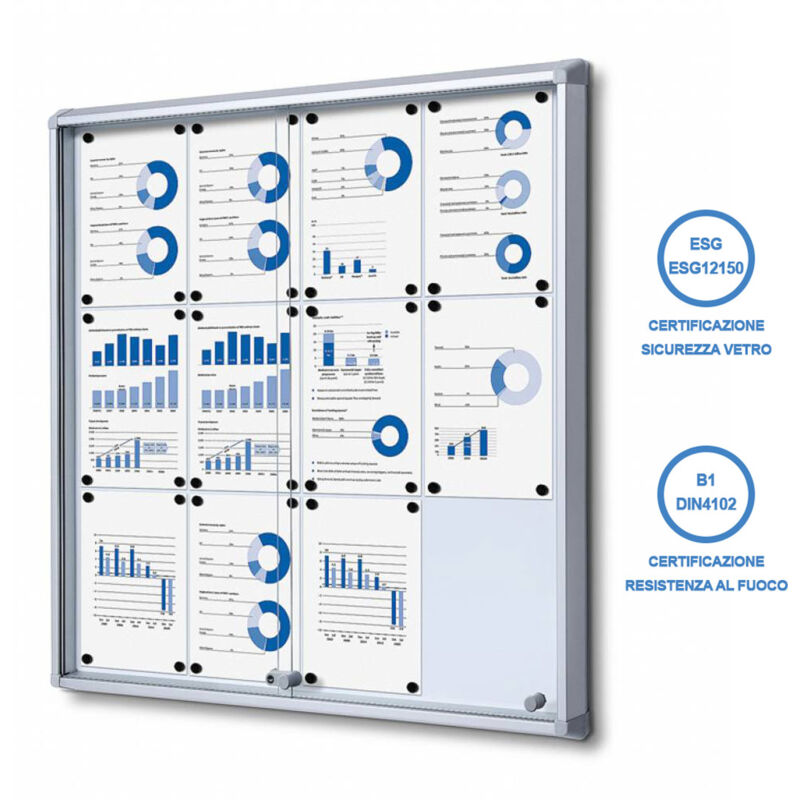 Bacheca Bacheca con Ante Scorrevoli 94x98,2x5,9 cm in Alluminio Fondo Magnetico Silver La bacheca magnetica per interni è realizzata in alluminio anodizzato silver, che offre resistenza e durabilità nel tempo. La superficie è in acciaio laccato magnetica e scrivibile, permettendo di fissare facilmente i documenti con magneti e di prendere appunti direttamente sulla bacheca. Le ante in vetro temperato scorrono lateralmente, offrendo un'apertura e chiusura agevole e sicura grazie alla serratura. Con uno spessore di vetro di 4 mm e una certificazione ESG e ignifuga B1, la bacheca garantisce la sicurezza degli utenti e dei documenti. È inclusa anche il kit per il fissaggio a parete, e le dimensioni sono di 94x98,2x5,9 cm, con un formato di 12XA4. Caratteristiche Tecniche Bacheca magnetica per interni Materiale: in alluminio anodizzato silver Superficie in acciaio laccato magnetica e scrivibile Con ante in vetro temperato Ante ad apertura scorrevole e chiusura con serratura Spessore vetro