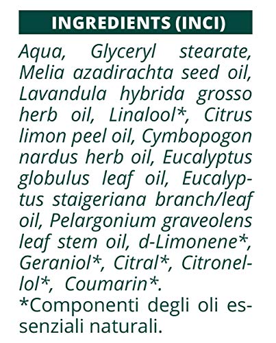 A base di olio di neem ed oli essenziali di lavanda, citronella di giava, eucalipto, limone, geranio ed eucalipto staigeriana