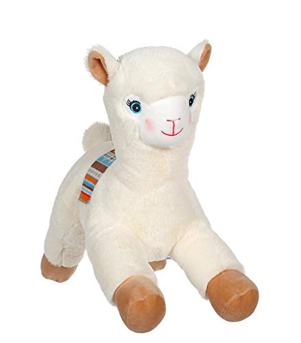 Lama in peluche di forma allungata con un tappetino colorato sul retro.