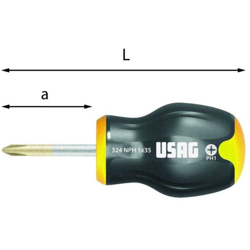 USAG 324 NPH GIRAVITE A CROCE NANO CORTO CACCIAVITE GIRAVITI NANI CORTI PROFESSI • Modello corto • Punta zincata che garantisce un'elevata resistenza all'usura ed alla corrosione • Lama in acciaio al Cromo Silicio Vanadio per un'ottima resistenza alla flessione • Impugnatura ergonomica trimateriale con rivestimento soft grip, resistente ad olii ed agenti chimici • Codice colore sull'impugnatura per distinguere le diverse impronte Codice n°xa L mm Misura impugnatura U03240468 1x35 91 M10 U03240469 2x35 91 M12 Codicen°xaL mmMisura impugnatura Q.tà x conf. Prezzo listino U032404681x3591M05€ 5.43U032404692x3591M25€ 5.96