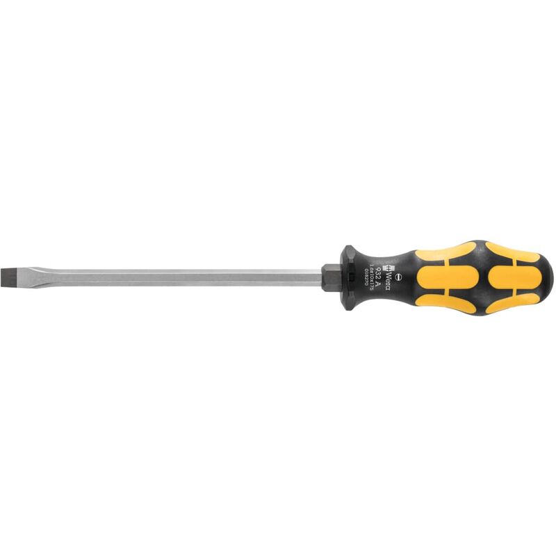 Impugnatura Kraftform in plastica resistente agli urti con zone morbide integrate e cappuccio a percussione (Dim. 12 e 14 senza zone morbide, Dim. 3,5 senza cappuccio a percussione e lama passante). Lama esagonale in acciaio speciale tenace, di tipo passante. Da Dim. 4,5 con esagono di manovra, superficie cromata nicromatt. Dati tecnici Tipo di prodotto Giravite Lunghezza complessiva, mm 287 Lunghezza lama, mm 175 Larghezza delle punte b, mm 10 Spessore delle punte a, mm 1,6 Esagono di manovra, mm 13 Denominazione originale prodotto 932A