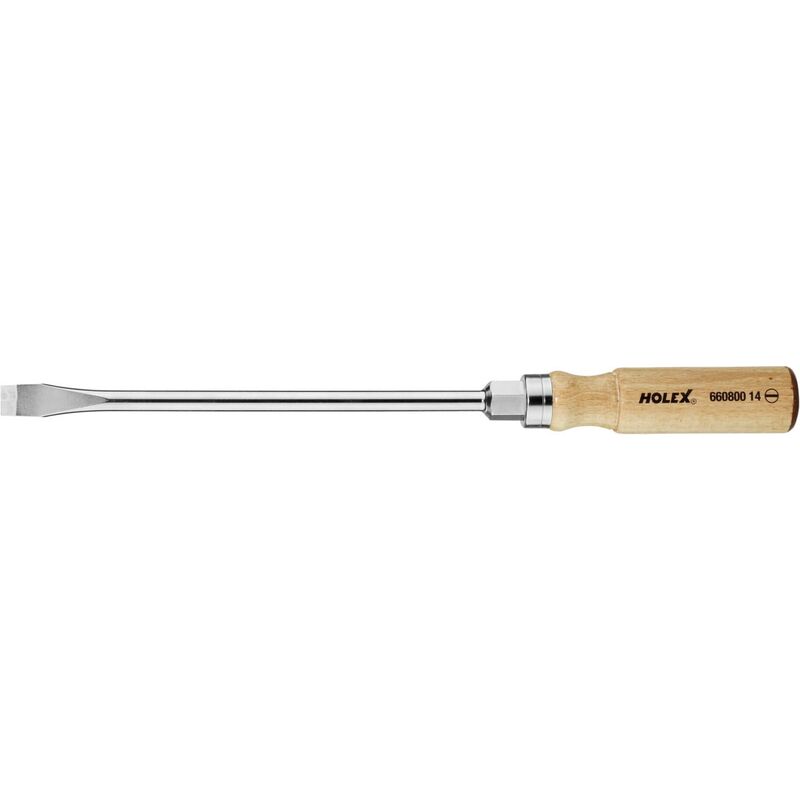 Impugnatura in legno di faggio sigillato, con cappuccio di pelle. Lama in acciaio al cromo-vanadio, interamente temprata. A partire da Dimensione 5,5 lama passante con esagono di manovra. Superficie nichelata lucida. Dati tecnici Tipo di prodotto Giravite Lunghezza complessiva, mm 384 Lunghezza lama, mm 250 Larghezza delle punte b, mm 14 Spessore delle punte a, mm 2,5 Esagono di manovra, mm 17