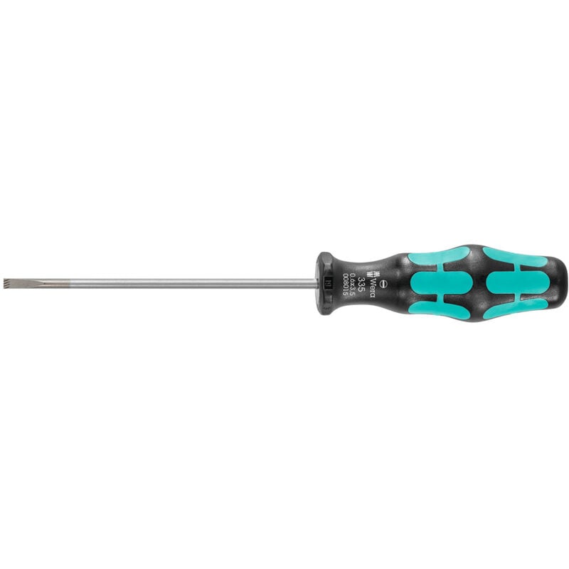 Lame forgiate, le punte si adattano perfettamente alle impronte normalizzate delle viti. L'impugnatura Kraftform in plastica resistente agli urti, con zone morbide integrate facilita la trasmissione del momento torcente e pertanto non stanca né mano né braccio. Lama in acciaio speciale altamente legato. Superficie cromata nicromatt, punte brunite o Lasertip rivestite chimicamente con nichel. Norma: DIN 5265 Form A Nota: La massima durata dei girativi a norma è garantita se i giraviti vengono utilizzati su viti con intaglio secondo normativa, e quindi con corrispondenza esatta (vedi tabella). Dati tecnici Tipo di prodotto Giravite Lunghezza complessiva, mm 181 Lunghezza lama, mm 100 Larghezza delle punte b, mm 3,5 Spessore delle punte a, mm 0,6 Punta della lama nero Denominazione originale prodotto 335