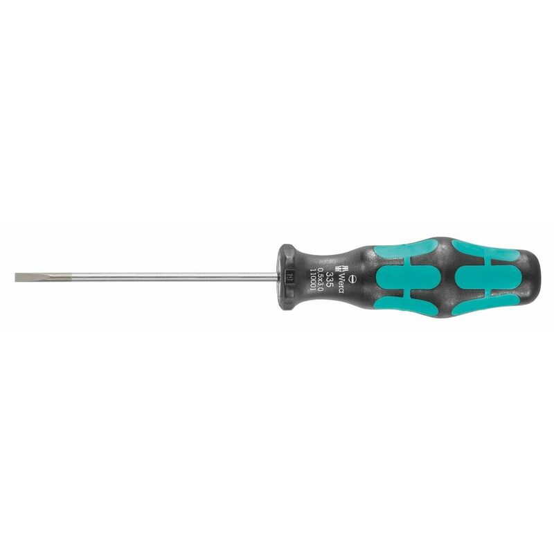 Lame forgiate, le punte si adattano perfettamente alle impronte normalizzate delle viti. L'impugnatura Kraftform in plastica resistente agli urti, con zone morbide integrate facilita la trasmissione del momento torcente e pertanto non stanca né mano né braccio. Lama in acciaio speciale altamente legato. Superficie cromata nicromatt, punte brunite o Lasertip rivestite chimicamente con nichel. Norma: DIN 5265 Form A Nota: La massima durata dei girativi a norma è garantita se i giraviti vengono utilizzati su viti con intaglio secondo normativa, e quindi con corrispondenza esatta (vedi tabella). Dati tecnici Tipo di prodotto Giravite Lunghezza complessiva, mm 161 Lunghezza lama, mm 80 Larghezza delle punte b, mm 3 Spessore delle punte a, mm 0,5 Punta della lama nero Denominazione originale prodotto 335