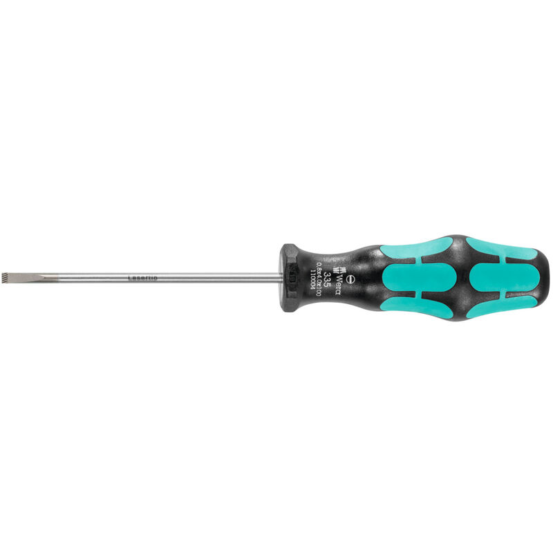 Lame forgiate, le punte si adattano perfettamente alle impronte normalizzate delle viti. L'impugnatura Kraftform in plastica resistente agli urti, con zone morbide integrate facilita la trasmissione del momento torcente e pertanto non stanca né mano né braccio. Lama in acciaio speciale altamente legato. Superficie cromata nicromatt, punte brunite o Lasertip rivestite chimicamente con nichel. Norma: DIN 5265 Form A Nota: La massima durata dei girativi a norma è garantita se i giraviti vengono utilizzati su viti con intaglio secondo normativa, e quindi con corrispondenza esatta (vedi tabella). Dati tecnici Tipo di prodotto Giravite Lunghezza complessiva, mm 198 Lunghezza lama, mm 100 Larghezza delle punte b, mm 4 Spessore delle punte a, mm 0,8 Punta della lama Lasertip Denominazione originale prodotto 335