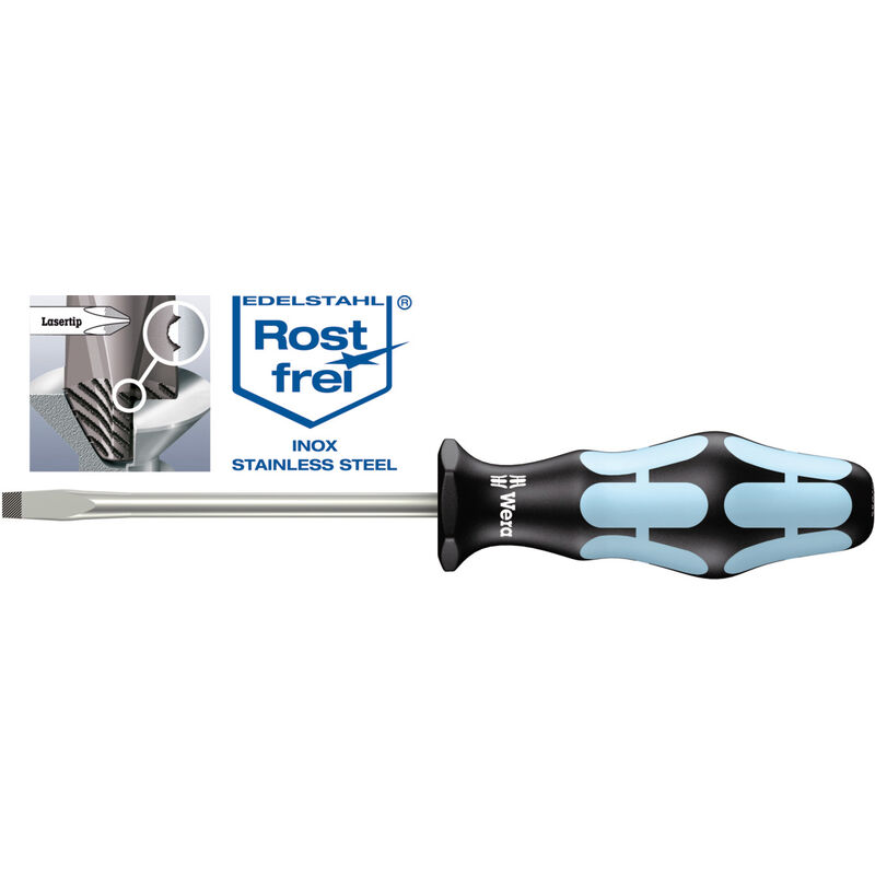 Lame forgiate, le punte si adattano perfettamente alle impronte normalizzate delle viti. L'impugnatura Kraftform in plastica resistente agli urti, con zone morbide integrate facilita la trasmissione del momento torcente e pertanto non stanca né mano né braccio. Lama Wera Lasertip in acciaio inox con tagliente conico ed estremità microruvida (a partire da Dim. 3,5). Norma: DIN 5265 Form A Nota: La massima durata dei girativi a norma è garantita se i giraviti vengono utilizzati su viti con intaglio secondo normativa, e quindi con corrispondenza esatta (vedi tabella). Dati tecnici Materiale Acciaio legato, INOX Tipo di prodotto Giravite Lunghezza complessiva, mm 312 Lunghezza lama, mm 200 Larghezza delle punte b, mm 10 Spessore delle punte a, mm 1,6 Denominazione originale prodotto 3334