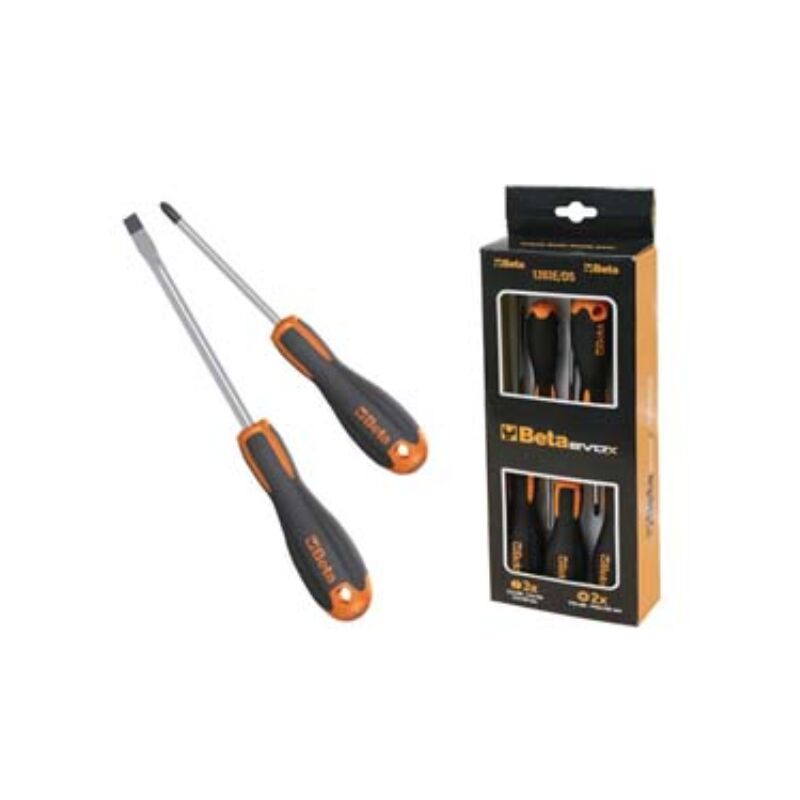 Lama in acciaio temperato cromato con punta nera, impugnatura bimateriale in polipropilene, duro e resistente di colore arancio con rivestimento in gomma nera contenuto pz.3 art.1201 lama piatta taglio 3,5x100 - 5,5x150 - 6,5x150 pz.2 art.1202 lama croce phillisp ph1 4,5x80 - ph2 6x100 Categoria merceologica: Giraviti - Utensili manuali - Giraviti in serie Beta