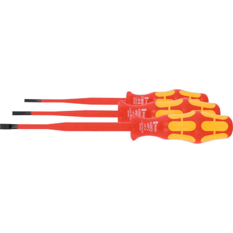 la rigidità dielettrica dell'isolamento equivale a un multiplo della tensione minima di prova secondo norme di sicurezza VDE. Ognuno di questi giravite è collaudato singolarmente in bagno d'acqua per verificarne la resistenza.L'impugnatura Kraftform in plastica resistente agli urti, con zone morbide integrate facilita la trasmissione del momento torcente e pertanto non stanca né mano né braccio.Lama in acciaio speciale altamente legato con tagliente conico, fosfatato allo zinco. ⌀ Ridotto della lama con isolamento di protezione integrato per elementi a vite e a molla in profondità (⌀ Lama = ⌀ Isolamento nella parte anteriore della lama). Uso: Per lavori su impianti elettrici in tensione fino a