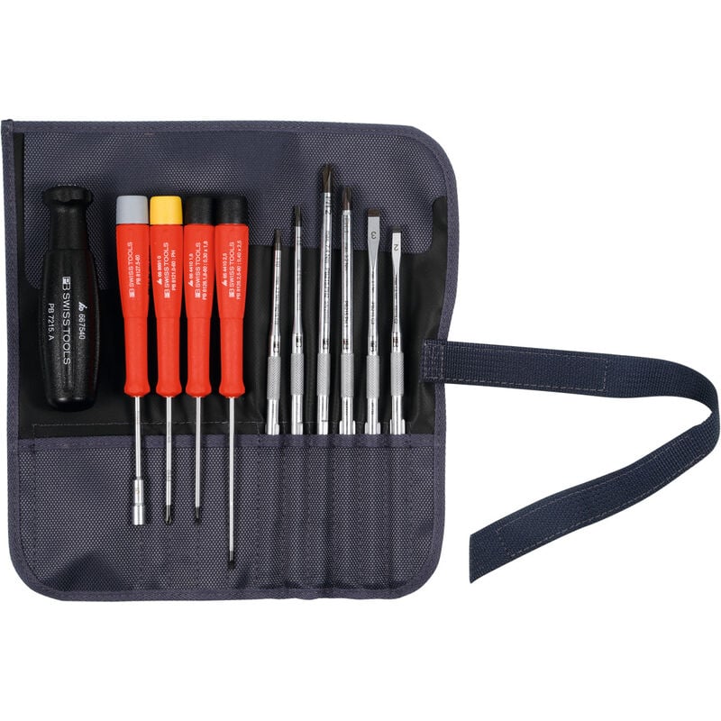 Lama in lega speciale PB Swiss Tools particolarmente tenace e dall'elevata durezza. Lame per viti con testa a intaglio, perfettamente conformi agli intagli delle viti normalizzate grazie al tagliente pianparallelo ribassato. Punte delle lame per viti con intaglio a croce fresate di precisione. Superficie nichelata e cromata, punta brunita. Impugnatura robusta “multicraft” in plastica resistente agli urti (senza cadmio), a presa particolarmente sicura, anche con le mani sporche di olio. Selezionato appositamente per lavori su PC. Contenuto: lame per viti a intaglio n. art. 659928: Dim. 4 e 5,5 Lama per viti Phillips n. art. 659921: Dim. 1 e 2 Lama per viti Torx® n. art. 659922: Dim. TX10 e TX15 Giravite di precisione (per viti con intaglio) n. art. 664415: Dim. 2 e 3 Cacciavite di precisione (per viti con impronta a croce Phillips) n. art. 668891: Dim. 0 Chiavi a bussola di precisione (per viti con esagono esterno): 5 mm Impugnatura in plastica: 1 pz. Fornitura: Inclusa busta