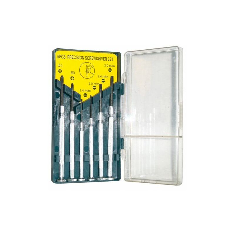 SET GIRAVITI PRECISIONE Assortimento in astuccio di plastica di 6 pezzi composto da: 4 a lama fissa: 1,4 mm - 2,0 mm - 2,4 mm - 3,0 mm. 2 a lama a croce: ph1 - ph 0.