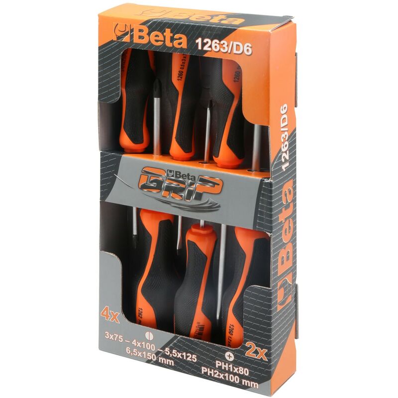 Serie di 6 pezzi per meccanico. L'impugnatura bimateriale ha vantaggi ergonomici sostanziali. La punta è priva di cromatura ed è protetta dall'ossidazione con un trattamento di fosfatazione. Confezione contenente: 0,5x3x75 - 0,8x4x100 - 1x5,5x125 - 1,2x6,5x150 - PH1x4,5x80 - PH2x6x100,0