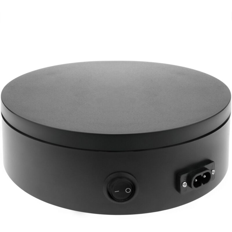Base girevole motorizzata. È una piattaforma che ruota lentamente e in modo sostenibile, quando attivata. Si collega alla rete elettrica. Ideale per la fotografia di modelli fotografici, realizzazione di modelli 3D, mostre, vetrine, pubblicità, ecc. Specifiche Misure: 20 cm (diametro) x 6 cm (altezza). Base rotonda in MDF e supporto in plastica ABS. Colore nero Carico supportato: 30 Kg. Girare: 360 °. Direzione oraria e antioraria. Rotazione motorizzata manuale o automatica. Sistema di frizione che consente di frenare o accelerare la piattaforma, anche se attivato. Velocità a una rotazione: 25 secondi. Interruttore ON/OFF. Cambio di direzione spegnendo e sul dispositivo. Si collega direttamente alla rete220 VCA elettrici