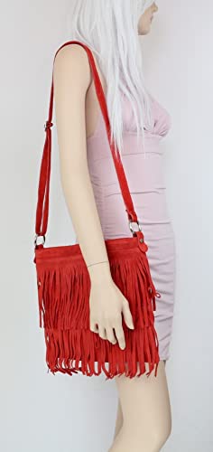 Borsa a tracolla in vera pelle scamosciata con dettagli in frangia sul davanti.