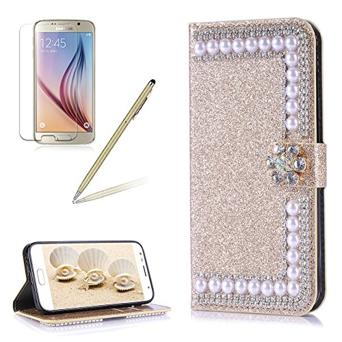 Girlyard Custodia per Samsung Galaxy A5 2017 Portafoglio Bling Perla, Brillantini Glitter Ragazza Donna Disegni Antiurto Morbida Wallet Case in Pelle Cover Full Body Protezione a Libro Chiusura Magnetica Supporto Antiscivolo per Samsung Galaxy A5 2017 Copertura Protettiva [Pearl Oro Gold]