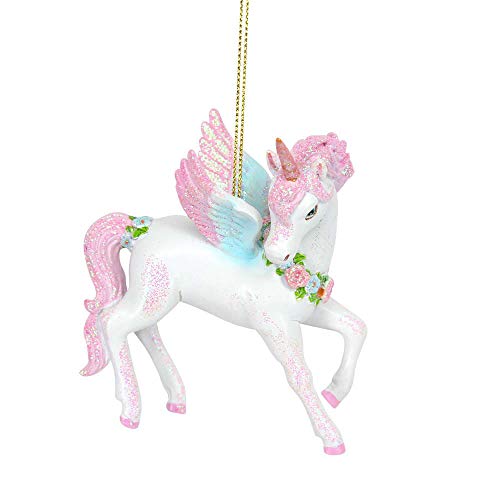 Sparkling unicorno bianco e rosa con fiori e foglie ghirlanda intorno al collo e alla coda.