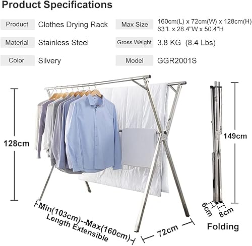 Design estensibile: può essere regolato in base alle dimensioni della stanza, lunghezza dell'asciugatrice, tre aste orizzontali allungabili da 103 cm a 160 cm, la dimensione massima è di 160 cm (lunghezza) x 72 cm (larghezza) x 128 cm (altezza), offre più spazio per appendere i vestiti