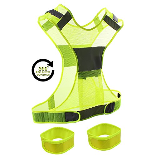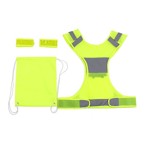 Un giubbotto catarifrangente più due polsini catarifrangenti e borsa. Comodo, modellabile e leggera attrezzatura con tasca per corsa, jogging e passeggio.
