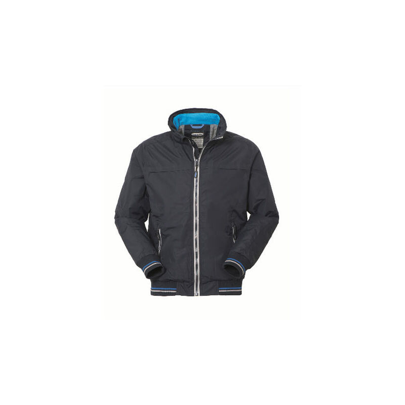 Chiusura con cerniera centrale, 2 tasche inferiori a filetto chiuse con cerniera, 1 taschino interno verticale al petto destro chiuso con cerniera, polsi e fascia in vita in maglia elastica con profili di colore a contrasto, foro di aerazione su schiena, collo imbottito con ovatta e interno del collo in micropile.