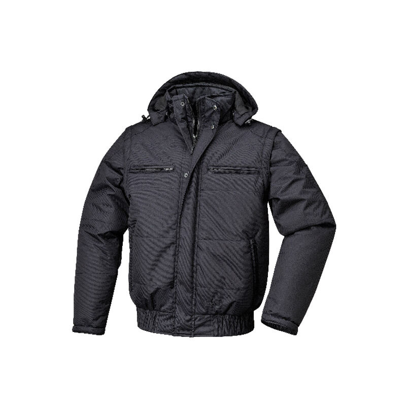 Giaccone bomber impermeabile imbottito e foderato internamente Beta Work 7780N, con cappuccio e maniche staccabili. 100% poliestere dobby 230T, impermeabilizzato 1000 Foderato in 100% poliestere T190 Imbottitura in poliestere 140 g Cappuccio e maniche staccabile imbottito e foderato con regolatori a coulisse Chiusura frontale con zip, coperta da patta con chiusura a bottoni automatici Due tasche al petto con chiusura zip, una dotata di inserto portabadge Due tasche in vita con chiusura zip Tasca interna sinistra con chiusura a strappo Tasca interna destra con chiusura zip Taschino porta penna sul braccio sinistro