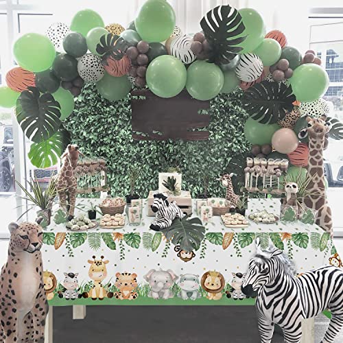 Set di stoviglie per feste safari nella giungla: contiene 10 piatti da 18 cm + 10 pezzi di carta velina quadrata da 16 cm + tovaglia da 1,3 x 2,2 m + 13 cm bandiere per torta di animali + 4 pezzi da 8 cm (ippopotamo/zebra/leone/tigre/giraffa/elefante)