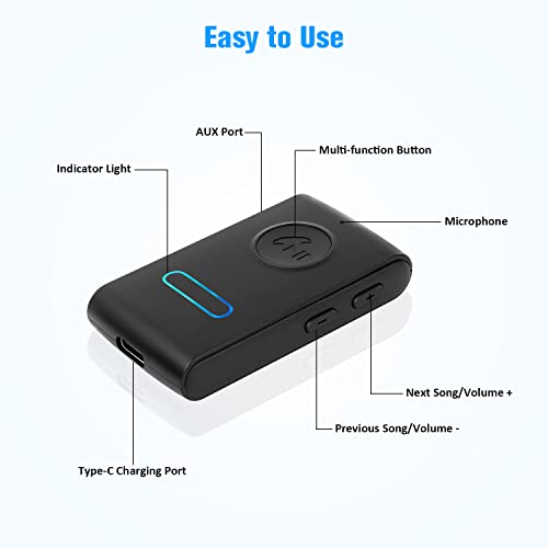 Microfono integrato per chiamate in vivavoce: questo adattatore Bluetooth AUX integrato nel microfono, un pulsante multifunzione con un clic per riprodurre/mettere in pausa/risposta/ricomporre/riagganciare/rifiutare le chiamate per rendere le mani libere. Supporta anche la trasmissione di notifica vocale da esistente App di navigazione, non è necessario guardare in basso il telefono per garantire una guida sicura.