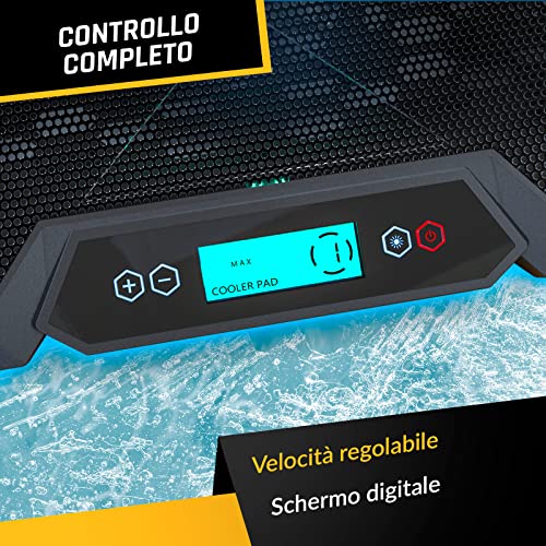 ✅ ELEGANTE, ROBUSTO, EFFICACE. Questo supporto per PC portatile con ventole ha una superficie molto ampia, perfetta anche per i laptop da gioco più grandi. È dotato di ben sei ventole che ruotano a 2100 giri/min, creando un potente flusso d'aria che abbassa la temperatura in pochi secondi. Regola comodamente la velocità delle ventole in base alle tue necessità utilizzando i pulsanti anteriori e usa il