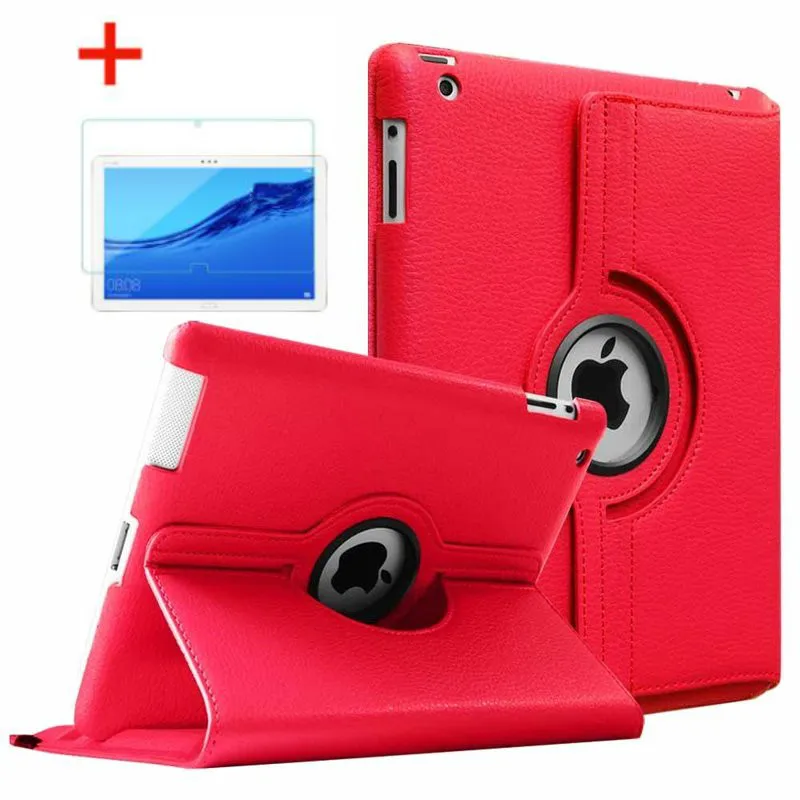 For iPad 2 3 4 Glass and Case 360 Degree Rotating PU Leather Cover for Apple iPad 2 3 4 Smart Tablet Cases for A1395 A1396 A1430