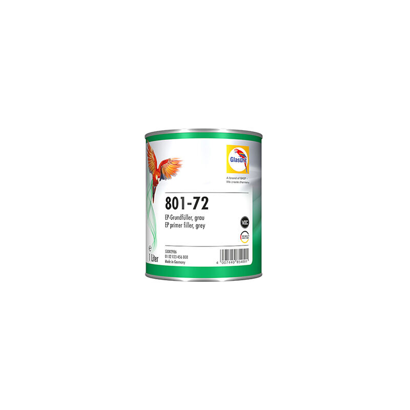 • GLASURIT 801-72 PRIMER RIEMPITIVO EP VOC • LT 1 GLASURIT 801-72 VOC PRIMER RIEMPITIVO EP VOC, PROMOTORE D'ADESIONE, COLORE GRIGIO Questo primer riempitivo basato sulla comprovata tecnologia epossidica è un partner affidabile delle carrozzerie, che assicura un'eccellente protezione contro la corrosione. Glasurit 801-72 Primer riempitivo EP VOC, grigio, è l'ideale quando si tratta di adesione. Assicurando un'eccellente adesione a tutti i supporti metallici scoperti standard, si presenta come il prodotto di PRIMA SCELTA per la verniciatura di materiali metallici critici.