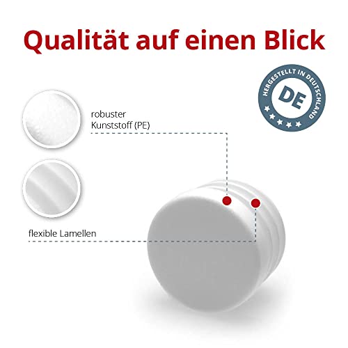 Dati tecnici: diametro esterno del tappo: 20 mm, per tubo interno 16,5 - 18,5 mm, contenuto della confezione: 4 tappi | Materiale: polietilene (PE) | Prodotto in Germania | Colore: bianco