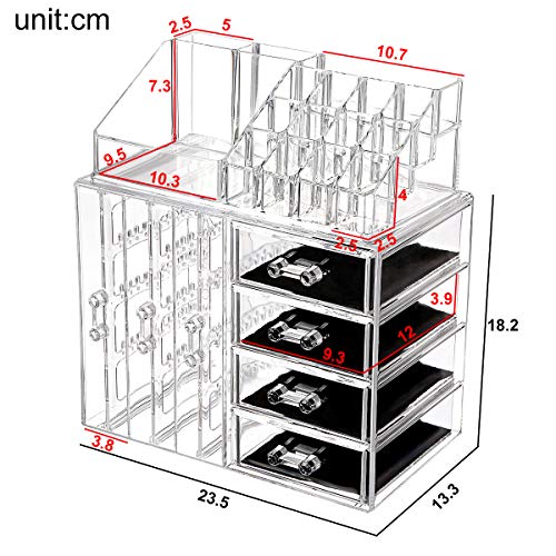 Design compatto e salvaspazio, questo trasparente organizzatore di gioielli ha 3 pannelli estraibili per l'orecchio e 4 cassetti rimovibili sul lato disposti verticalmente, il vassoio superiore si adatta a rossetti, pennelli, palette, fondotinta, un perfetto organizzatore di gioielli e cosmetici da tenere la tua toeletta ordinata ed elegante