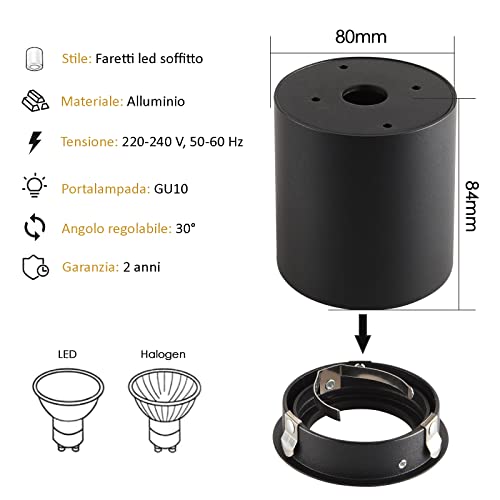 【Confezione】: 1 Faretti da Soffitto Orientabili (colore: Nero sabbia opaco, dimensioni: Ø80x84), inclusa 1 presa GU10, morsettiera, 2 viti e 2 perni di posizionamento, istruzioni per l'installazione. Forniamo servizio post-vendita. In caso di domande, contattare il servizio clienti online.