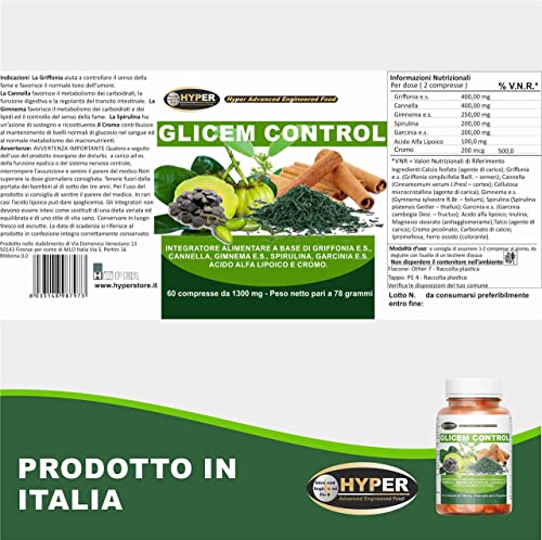 GLICEM CONTROL con Griffonia Cannella Gymnema Spirulina Garcinia Acido Alfa Lipoico Cromo Livello di Glicemia Metabolismo
