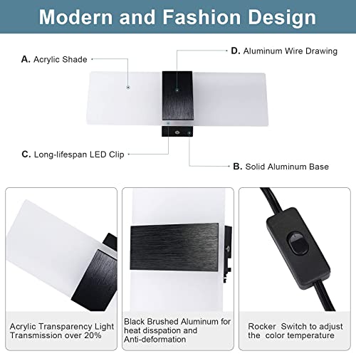 Glighone Applique da Parete Interno Moderno Dimmerabile 3 Temperature di Colore LED 12W Acrilico Lampada da Parete con spina Applique Moderna per Soggiorno, Corridoio, Camera da Letto, Nero