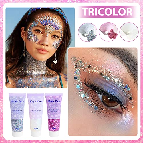 Glitter Gel Viso 3 Bottiglie +12 Pezzi Gel Glitter Per il Corpo Sirena Paillettes Brillantini Liquido Chunky Glitter for Face Hair Nails per Unghie, Occhi, Labbra,Festival, in Maschera