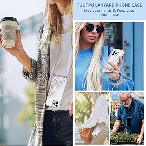 Glitter Cover con Cordino per iPhone 13 Pro, Custodia Brillantini Liquido Trasparente con Regolabile Collana Tracolla Laccio Collo Morbido TPU Silicone Antiurto Protettiva Necklace Case - Oro Rosa