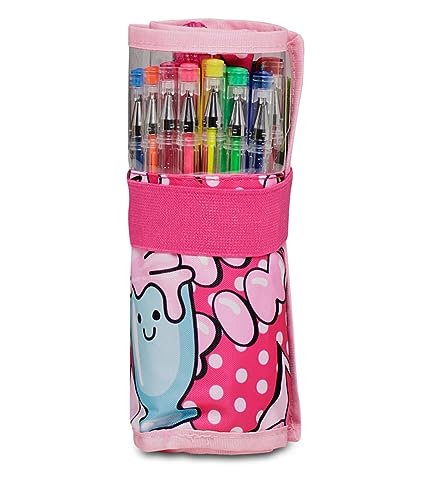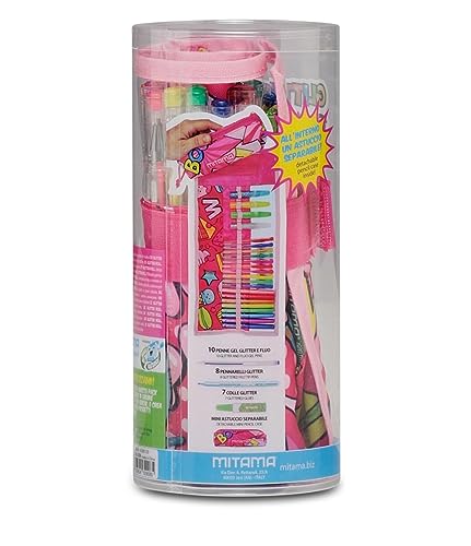CARATTERISTICHE: portapenne Roll arrotolabile. CONTENUTO: 10 penne gel colorate, 8 pennarelli glitter, 7 colle glitter.