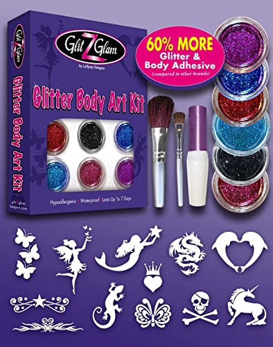 Il Kit per tatuaggi glitterati taglia Large della GlitZGlam Body Art include tutto ciò di cui hai bisogno per creare splendide body art (tatuaggi temporanei glitterati per bambini, adolescenti e adulti).