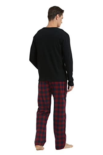 GLOBAL Pigiama Uomo Flanella Cotone Lungo Pigiami Pezzi Girocollo Invernale Abbigliamento da Notte Traspirante Confortevole e Caldo Top Nero, Pantaloni Quadri Rossi Neri S