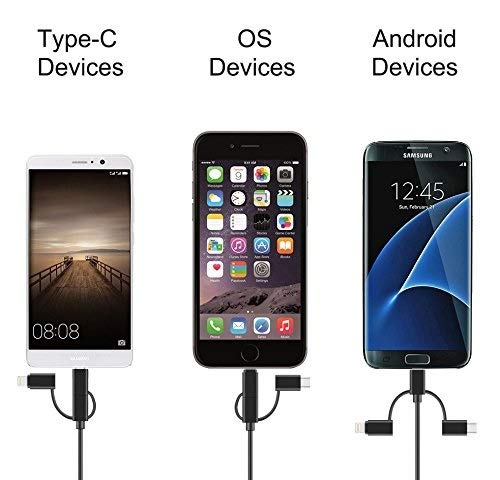 【COMPATIBILITÀ AMPIA】Il nostro cavo 3 in 1 è ampiamente compatibile con smartphone, tablet e altri dispositivi Android, Apple e USB-C, come Phone Xs, Xs Max, Phone 8 /8 Plus, 7 / 7Plus, 6 / 6Plus, Pad, Pad Pro, Pad Air, Samsung Galaxy S4 / Note 9 / S8 / S9, HUAWEI P20 / P20 Pro / P10 / P9, OnePlus 5 / 3T / 2, ChromeBook Google, Lumia 950 / 950XL, LG G5 / G6, ecc.