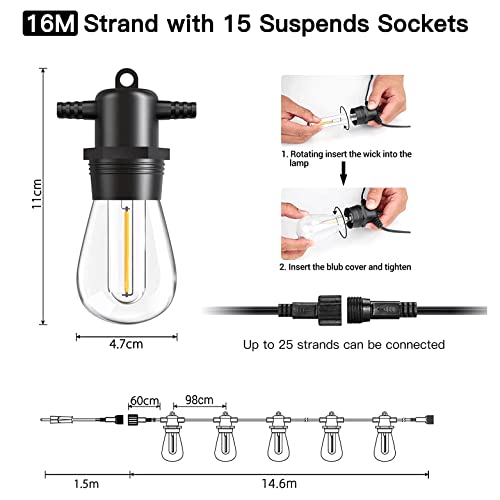 GlobaLink Catena Luminosa Esterno LED Collegabili, S14 Luci 16M/53FT con 15+1 Lampadine Infrangibili, IP65 Impermeabili Gazebo per Giardino Terrazza Partito-Bianco Caldo